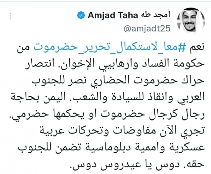وكتب في تغريدة على حسابه بموقع التدوين المصغر تويتر، اليوم أن: "نعم معا لاستكمال تحرير حضرموت من حكومة الفساد وإرهابيي الإخوان".