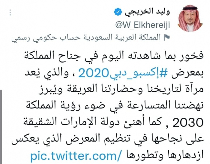 عبر نائب وزير الخارجية السعودي وليد الخريجي عن سعادته بزيارة جناح المملكة العربية السعودية في معرض إكسبو دبي 2020، ومحتواه المعبر لتاريخ وحضارة المملكة.