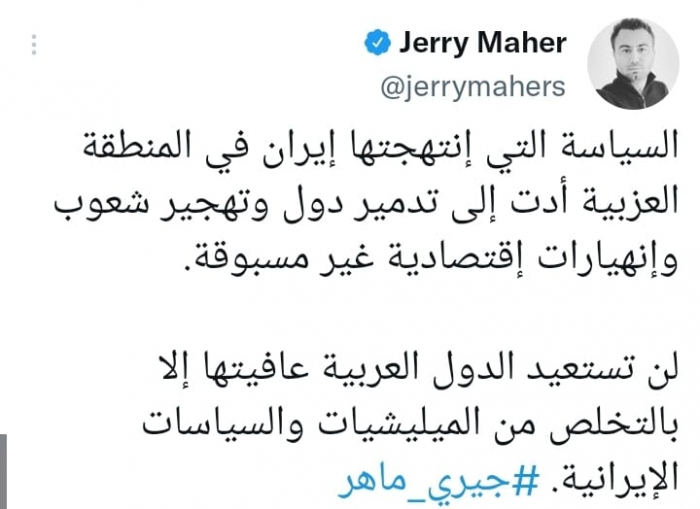 اعتبر الكاتب الصحفي جيري ماهر أن الطريق لاستعادة الدول العربية قدراتها الاقتصادية بعد الانهيارات المتتالية يتطلب القضاء على مليشيات إيران في المنطقة.