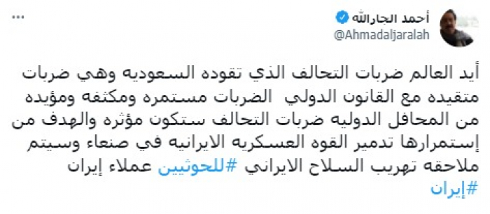 شدد الكاتب الصحفي الكويتي أحمد الجارالله، على التأييد الدولي لعمليات التحالف العربي ضد الحوثيين الإرهابيين في صنعاء، مؤكدا أن هناك ملاحقات لمحاولات طهران إمداد المليشيا الإجرامية بالسلاح.