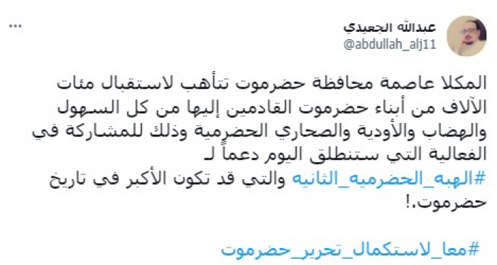 كشف عن اعتزامهم: "المشاركة في الفعالية التي ستنطلق اليوم دعما للهبة الحضرمية الثانية التي قد تكون الأكبر في تاريخ حضرموت"، مضيفا أننا: "معا لاستكمال تحرير حضرموت".
