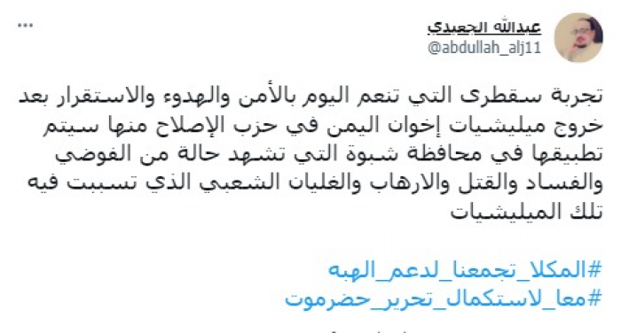 وأشار في تغريدة على تويتر، اليوم السبت إلى أن: "تجربة سقطرى التي تنعم اليوم بالأمن والهدوء والاستقرار بعد خروج مليشيات إخوان اليمن في حزب الإصلاح منها، سيتم تطبيقها في محافظة شبوة".