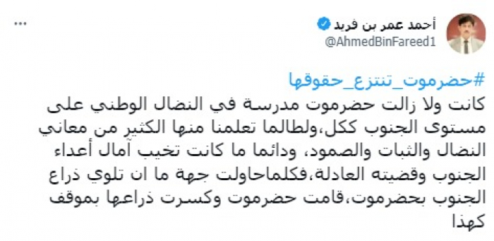 وشدد في تغريدة على حسابه بتويتر، اليوم السبت، على أنه: "كانت ولا زالت حضرموت مدرسة في النضال الوطني على مستوى الجنوب ككل".