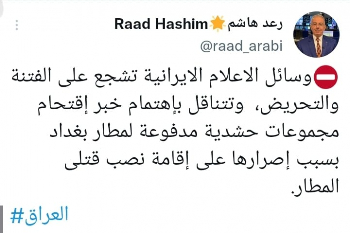 اتهم المحلل السياسي العراقي رعد هاشم، الإعلام الموالي لنظام ملالي طهران بالتحريض على العنف في العاصمة بغداد.