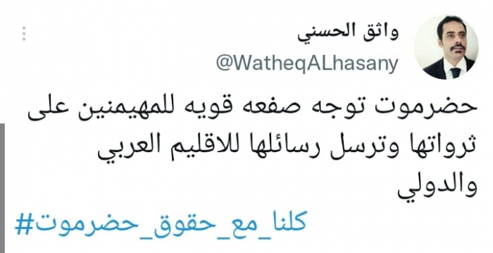وشدد في تغريدة على حسابه بموقع التدوين المصغر تويتر اليوم على أن: "حضرموت توجه صفعة قوية للمهيمنين على ثرواتها وترسل رسائلها للإقليم العربي والدولي"، مختتما بهاشتاج: "كلنا مع حقوق حضرموت".