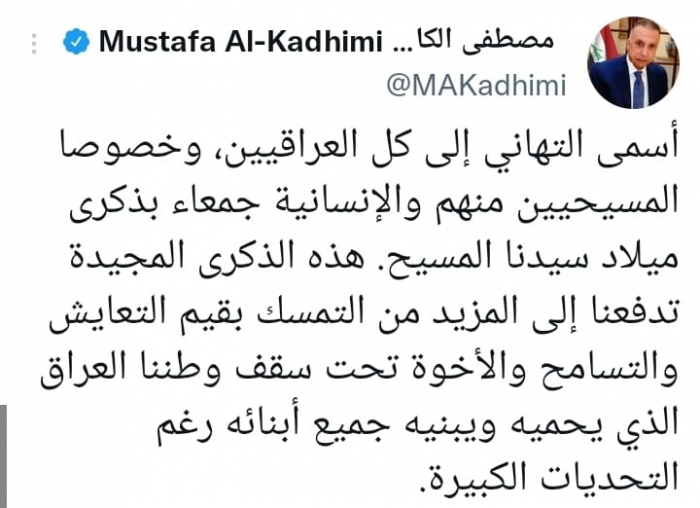 توجه رئيس الوزراء العراقي مصطفى الكاظمي، بالتهنئة إلى العراقيين بمناسبة أعياد الميلاد، داعيا إلى التمسك بأسس العيش المشترك كالتسامح والأخوة.