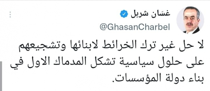 وأكد في تغريدة على حسابه بموقع التدوين المصغر تويتر، اليوم أنه: "لا حل غير ترك الخرائط لأبنائها وتشجيعهم على حلول سياسية تشكل المدماك الأول في بناء دولة المؤسسات".