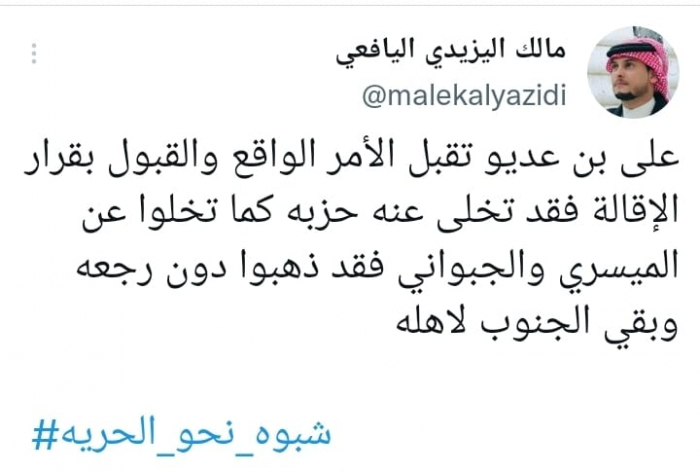 وكتب في تغريدة على حسابه بموقع التدوين المصغر تويتر اليوم: "على بن عديو تقبل الأمر الواقع والقبول بقرار الإقالة فقد تخلى عنه حزبه كما تخلوا عن الميسري والجبواني فقد ذهبوا دون رجعه وبقي الجنوب لأهله"، مختتما بهاشتاج: "شبوة نحو الحرية".