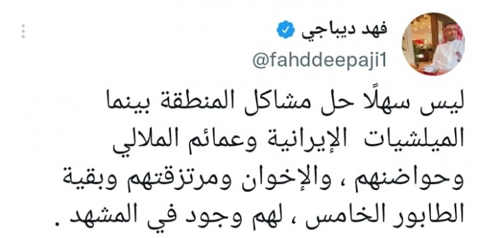 ورأى في تغريدة على حسابه بموقع التدوين المصغر تويتر، اليوم أنه: "ليس سهلًا حل مشاكل المنطقة بينما الميلشيات الإيرانية وعمائم الملالي وحواضنهم، والإخوان ومرتزقتهم وبقية الطابور الخامس، لهم وجود في المشهد".