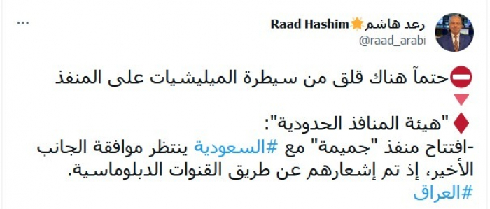 وأكد في تغريدة عبر "تويتر"، اليوم، أن: "هناك قلق من سيطرة المليشيات على المنفذ"، بعد إعلان هيئة المنافذ الحدودية العراقية، بأن افتتاح منفذ "جميمة" مع السعودية ينتظر موافقة الجانب الأخير، إذ تم إشعارهم عن طريق القنوات الدبلوماسية.