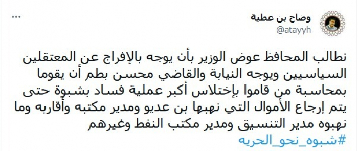 أوضح ذلك في تغريدة عبر "تويتر"، اليوم، قائلا: "نطالب المحافظ عوض الوزير بأن يوجه بالإفراج عن المعتقلين السياسيين، ويوجه النيابة والقاضي محسن بطم أن يقوما بمحاسبة من اختلسوا أكبر عملية فساد بشبوة حتى يتم إرجاع الأموال التي نهبها بن عديو ومدير مكتبه وأقاربه وما نهبه مدير التنسيق ومدير مكتب النفط وغيرهم".