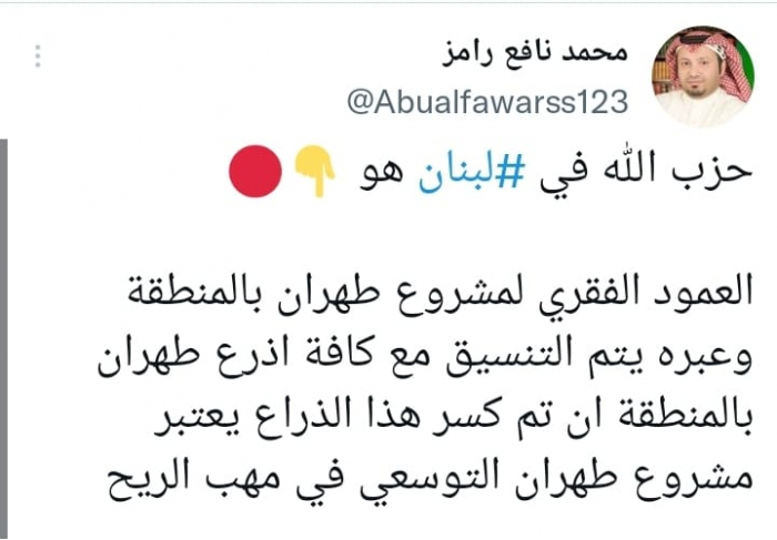 واعتبر في تغريدة على حسابه بموقع التدوين المصغر تويتر، اليوم أن: "حزب الله في لبنان هو العمود الفقري لمشروع طهران بالمنطقة".