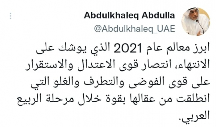 واعتبر في تغريدة على حسابه بموقع التدوين المصغر تويتر اليوم أن: "أبرز معالم عام 2021 الذي يوشك على الانتهاء، انتصار قوى الاعتدال والاستقرار على قوى الفوضى والتطرف والغلو التي انطلقت من عقالها بقوة خلال مرحلة الربيع العربي".