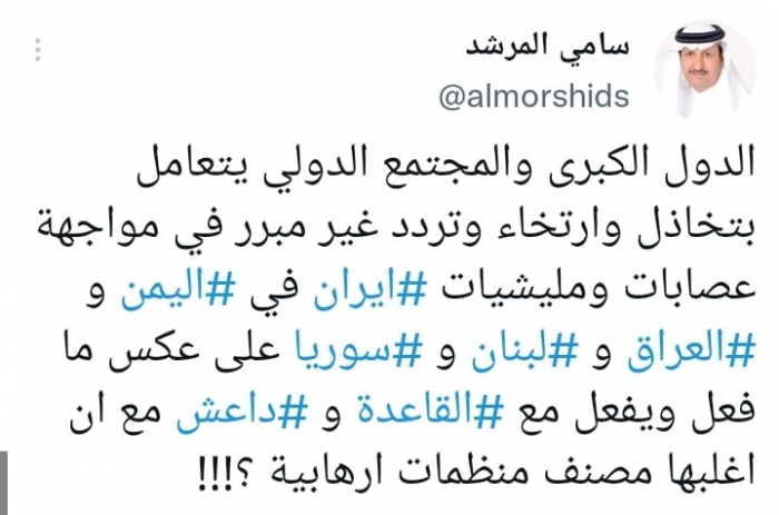 وأوضح في تغريدة على حسابه بموقع التدوين المصغر تويتر، اليوم أن: "الدول الكبرى والمجتمع الدولي يتعاملان بتخاذل وارتخاء وتردد غير مبرر في مواجهة عصابات ومليشيات إيران".