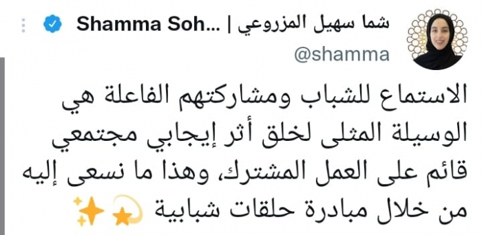 وأوضحت في تغريدة على حسابها بموقع التدوين المصغر تويتر، اليوم أن: "الاستماع للشباب ومشاركتهم الفاعلة هي الوسيلة المثلى لخلق أثر إيجابي مجتمعي قائم على العمل المشترك، وهذا ما نسعى إليه من خلال مبادرة حلقات شبابية".