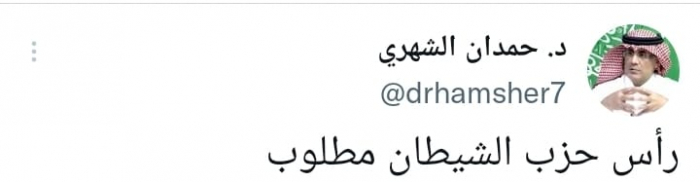 وقال في تغريدة على حسابه بموقع التدوين المصغر تويتر، اليوم إن: "رأس حزب الشيطان مطلوب"، في إشارة للمدعو حسن نصرالله زعيم مليشيا حزب الله.