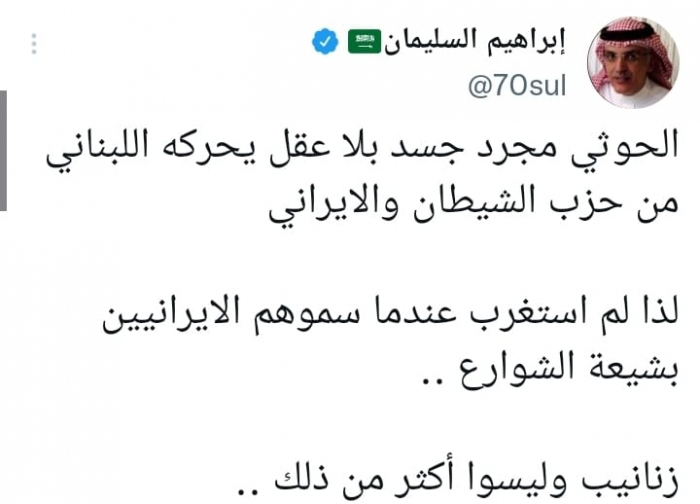وشدد في تغريدة على حسابه بموقع التدوين المصغر تويتر اليوم على أن: "الحوثي مجرد جسد بلا عقل يحركه اللبناني من حزب الشيطان والإيراني".