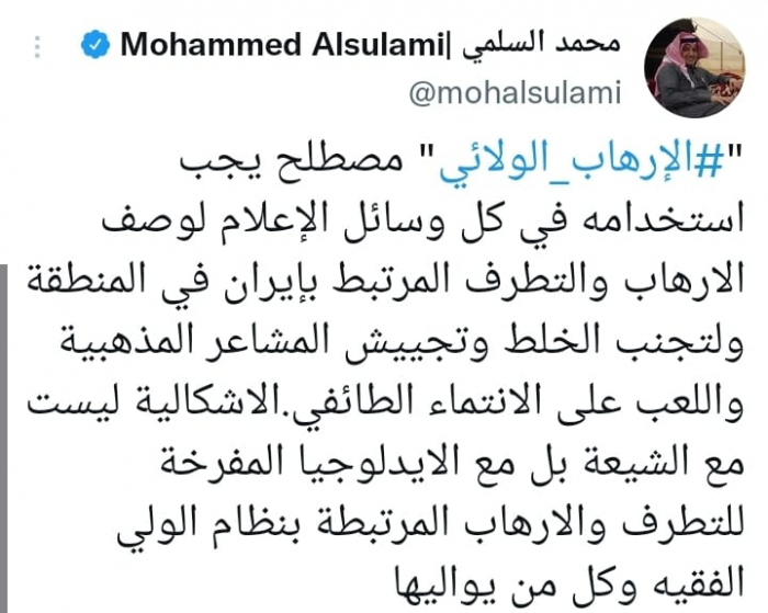 وقال في تغريدة على حسابه بموقع التدوين المصغر تويتر، اليوم إن: "الإرهاب الولائي، مصطلح يجب استخدامه في كل وسائل الإعلام لوصف الارهاب والتطرف المرتبط بإيران في المنطقة ولتجنب الخلط وتجييش المشاعر المذهبية واللعب على الانتماء الطائفي".