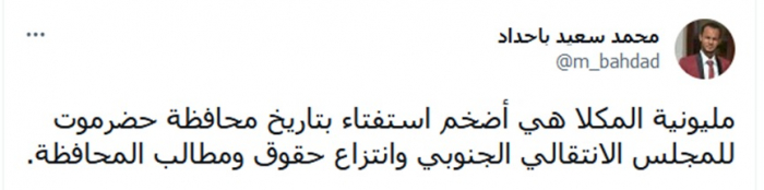 واعتبر في تغريدة عبر "تويتر"، اليوم، أن: "مليونية المكلا هي أضخم استفتاء بتاريخ محافظة حضرموت للمجلس الانتقالي الجنوبي وانتزاع حقوق ومطالب المحافظة".