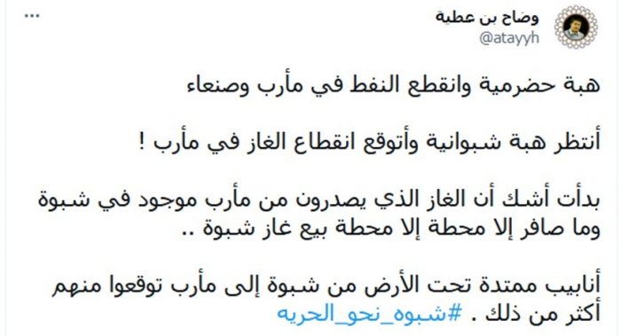 وكتب في تغريدة عبر "تويتر"، اليوم: "هبة حضرمية وانقطع النفط في مأرب وصنعاء.. وأنتظر هبة شبوانية واتوقع انقطاع الغاز في مأرب".