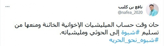 ولفت في تغريدة عبر "تويتر"، اليوم، إلى أنه: "حان وقت حساب المليشيات الإخوانية الخائنة ومنعها من تسليم شبوة إلى الحوثي ومليشياته"، مختتما تغريدته بهاشتاج: "شبوة نحو الحرية".
