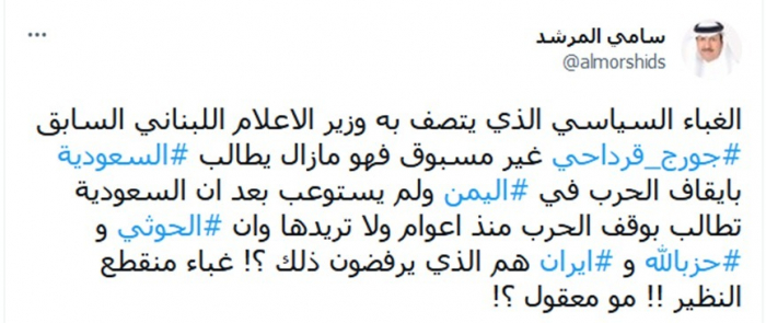 هاجم المحلل السياسي السعودي سامي المرشد، المدعو جورج قرداحي، وزير الإعلام اللبناني السابق، لإصراره على تصريحاته بشأن الحرب في اليمن.