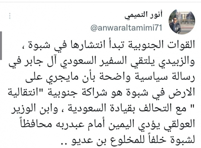 وأشار في تغريدة على حسابه بموقع التدوين المصغر تويتر، اليوم إلى أن: "القوات الجنوبية تبدأ انتشارها في شبوة، والزبيدي يلتقي السفير السعودي آل جابر".