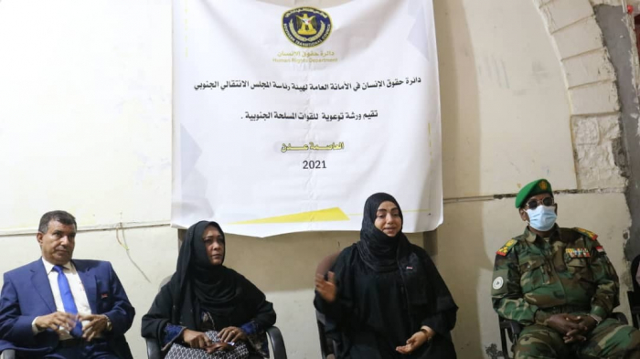 استهلت دائرة حقوق الإنسان في الأمانة العامة للمجلس الانتقالي الجنوبي، اليوم الثلاثاء، فعاليات ورشة توعوية لمنتسبي قوات العاصفة في معسكر 20 يونيو بالعاصمة عدن.