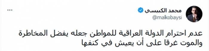 وأوضح في تغريدة عبر "تويتر"، اليوم: "عدم احترام الدولة العراقية للمواطن جعله يفضل المخاطرة والموت غرقا على أن يعيش في كنفها".