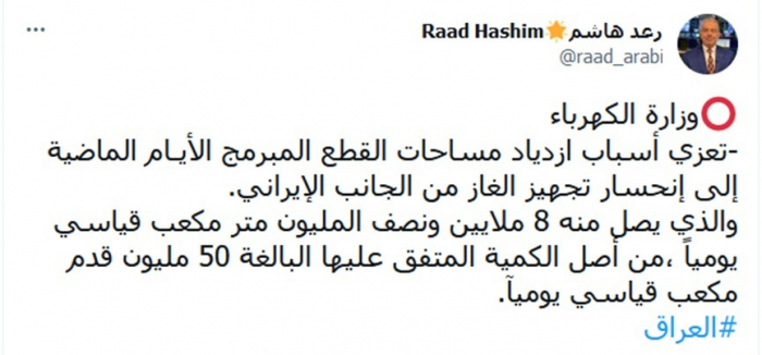 وتابع: "يصل منه 8 ملايين ونصف المليون متر مكعب قياسي يوميا، من أصل الكمية المتفق عليها البالغة 50 مليون قدم مكعب قياسي يوميا"، مختتما تغريدته بهاشتاج: "العراق".