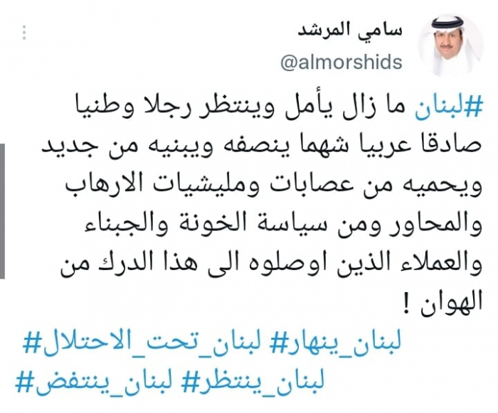 وأشار في تغريدة على حسابه بموقع التدوين المصغر تويتر، اليوم إلى أن: "لبنان ما زال يأمل وينتظر رجلا وطنيا صادقا عربيا شهما".