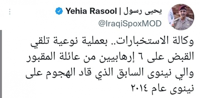 وأكد في تغريدة على حسابه بموقع التدوين المصغر تويتر، اليوم أن بجهود: "وكالة الاستخبارات"، كشف أنها نفذت: "عملية نوعية لتلقي القبض على 6 إرهابيين من عائلة المقبور والي نينوى السابق الذي قاد الهجوم على نينوى عام 2014".