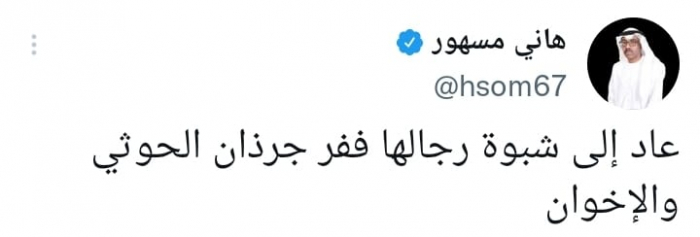 وكتب في تغريدة على حسابه بموقع التدوين المصغر تويتر، اليوم أنه: "عاد إلى شبوة رجالها ففر جرذان الحوثي والإخوان".
