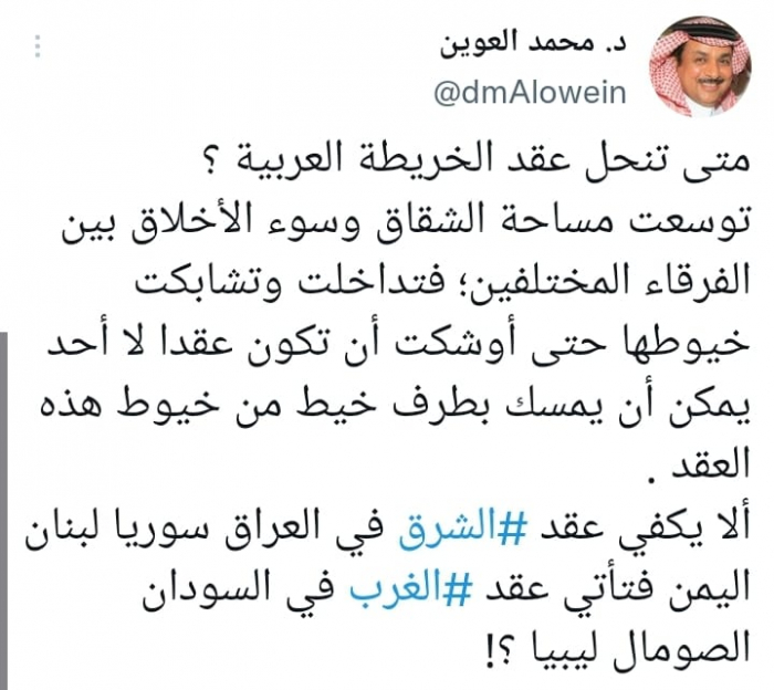 وتساءل في تغريدة على حسابه بموقع التدوين المصغر تويتر، اليوم: "متى تنحل عقد الخريطة العربية؟"، موضحا أنه: "توسعت مساحة الشقاق وسوء الأخلاق بين الفرقاء المختلفين".