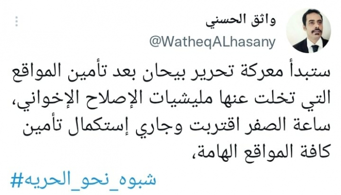 وكشف في تغريدة على حسابه بموقع التدوين المصغر تويتر، اليوم أنه: "ستبدأ معركة تحرير بيحان بعد تأمين المواقع التي تخلت عنها مليشيات الإصلاح الإخواني".
