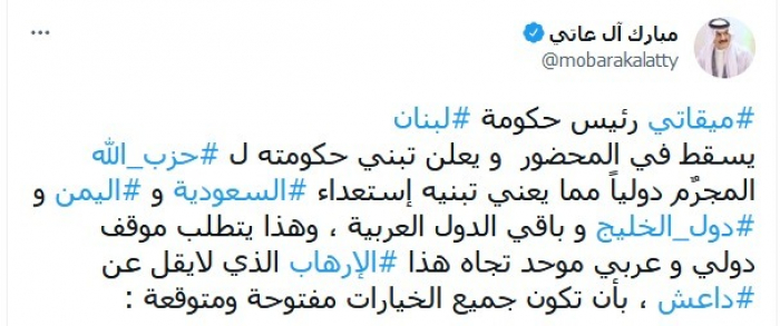 وذكر في تغريدة عبر "تويتر"، اليوم: "ميقاتي رئيس حكومة لبنان يسقط في المحظور ويعلن تبني حكومته لحزب الله المجرٌم دوليا مما يعني تبنيه استعداء السعودية واليمن ودول الخليج وباقي الدول العربية".