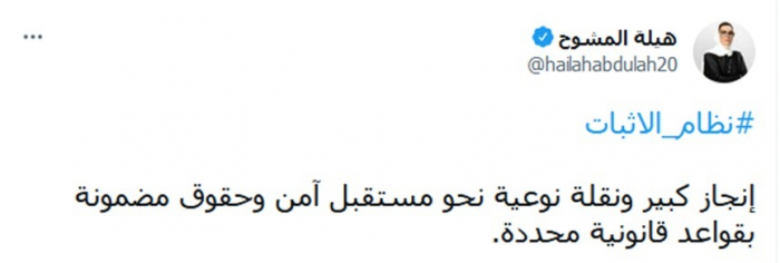 وكتبت في تغريدة عبر "تويتر"، اليوم: "نظام الإثبات.. إنجاز كبير ونقلة نوعية نحو مستقبل آمن وحقوق مضمونة بقواعد قانونية محددة".