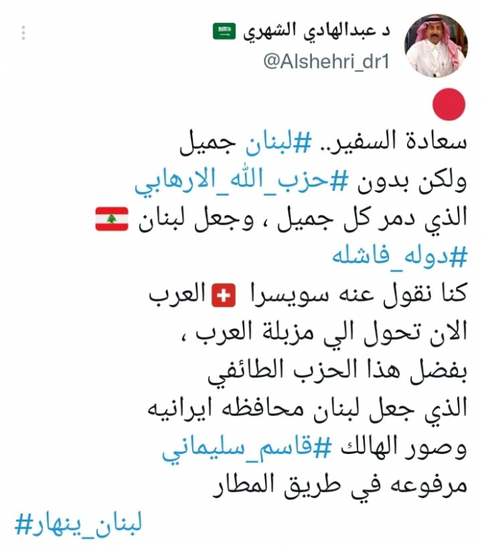 عبدالهادي الشهري: لبنان تحول إلى محافظة إيرانية