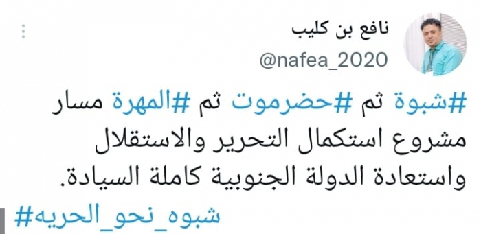 وأوضح في تغريدة على حسابه بموقع التدوين المصغر تويتر، اليوم أن: "شبوة ثم حضرموت ثم المهرة، مسار مشروع استكمال التحرير والاستقلال واستعادة الدولة الجنوبية كاملة السيادة"، مختتما: "شبوة نحو الحرية".