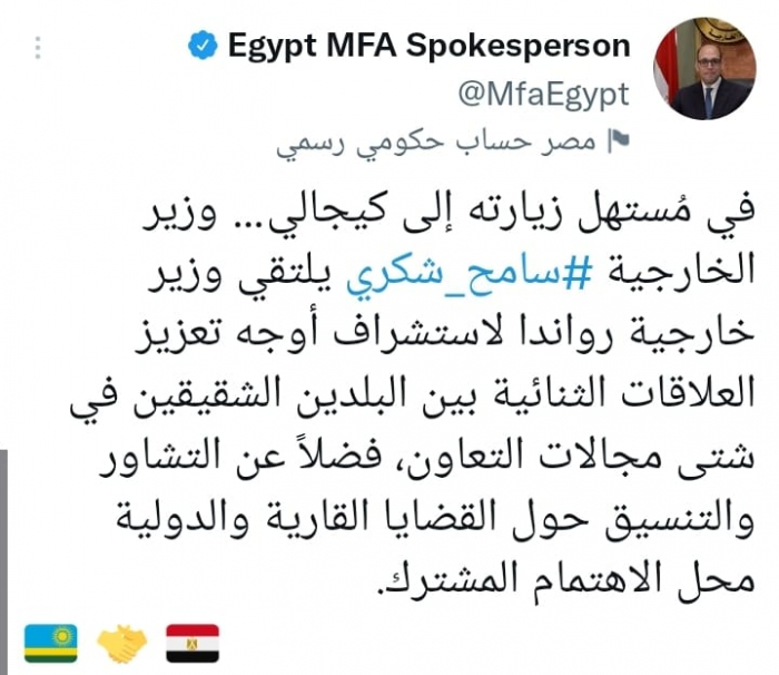 وقال السفير أحمد حافظ المتحدث باسم الخارجية المصرية في تغريدة على حسابه بموقع التدوين المصغر تويتر، اليوم إنه: "في مُستهل زيارته إلى كيجالي، وزير الخارجية سامح شكري يلتقي وزير خارجية رواندا".