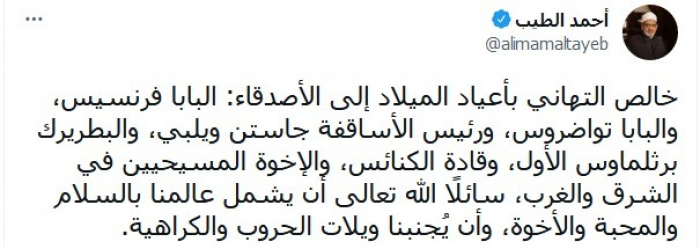 هنأ شيخ الأزهر، الدكتور أحمد الطيب، رموز الدين المسيحي، بمناسبة أعياد الميلاد، وعلى رأسهم البابا تواضروس، بابا الإسكندرية وبطريرك الكرازة المرقسية، والبابا فرنسيس، بابا الفاتيكان.