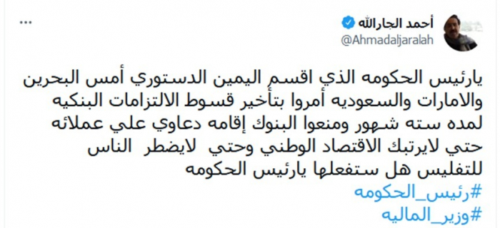 وجه عميد الصحافة الكويتية الكاتب أحمد الجارالله، نداء لرئيس الحكومة الجديد الشيخ صباح خالد الحمد الصباح، بتأخير أقساط البنوك لمدة 6 أشهر، والسير على خطى دول الإمارات والسعودية والبحرين.