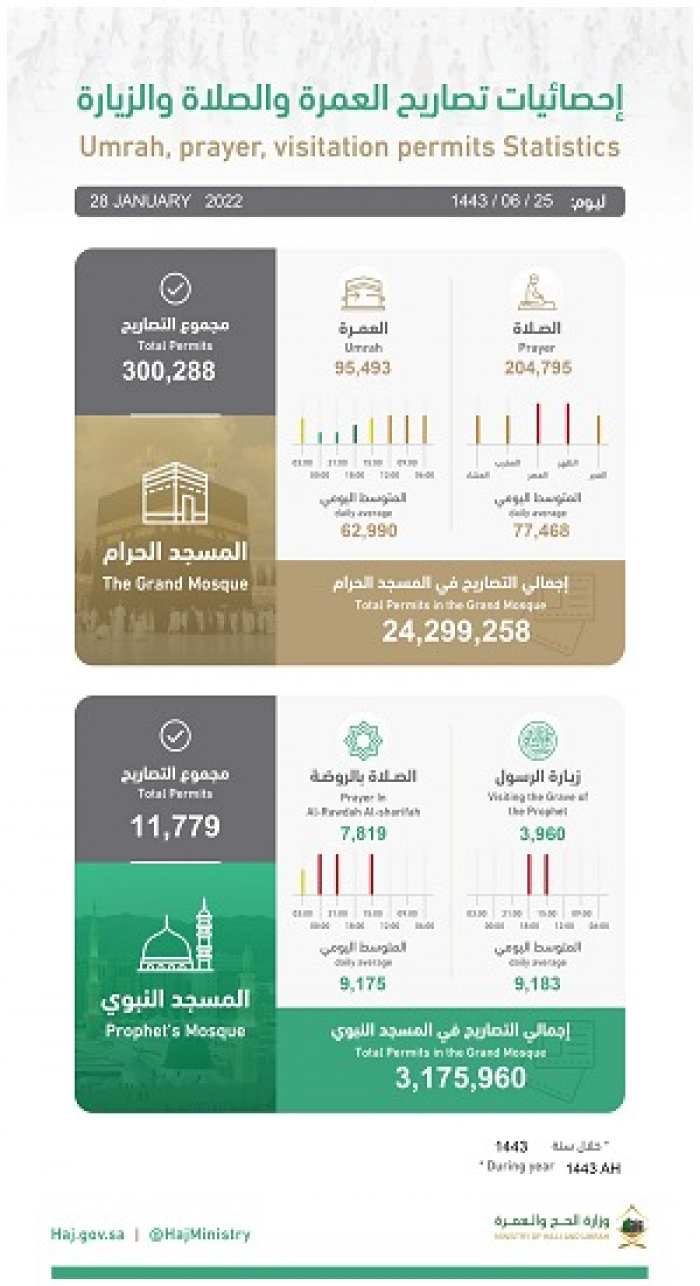 وكان التقرير اليومي لإحصائيات تصاريح الحرمين، أمس الجمعة، كالتالي: