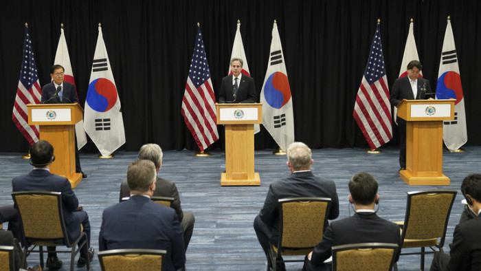 وكان بلينكن صرح أثناء مؤتمر صحفي عقد في أعقاب الاجتماع الثلاثي بأن واشنطن "تدين برنامجي كوريا الشمالية النووي والباليستي غير القانونيين" و"ستواصل العمل على إيجاد سبل لمعاقبة كوريا الشمالية".