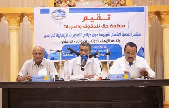 شهدت العاصمة عدن، صباح اليوم السبت، إشهار تقرير منظمة حق للحريات، بشأن جرائم التفجيرات الإرهابية في عدن وتخادم الإرهاب الحوثي الإخواني.
