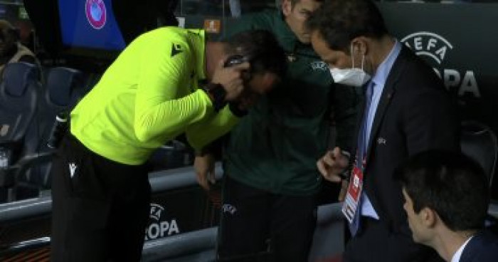 وحاول الحكم مراجعة كرة ارتدت من يد لاعب فرانكفورت داخل منطقة الجزاء إلا أنه فوجئ بتعطل شاشة التقنية.