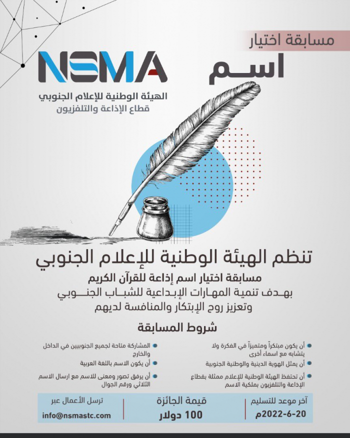 أعلنت الهيئة الوطنية للإعلام الجنوبي اليوم الاثنين،، تنظيم مسابقة لاختيار اسم لإذاعة القرآن الكريم.