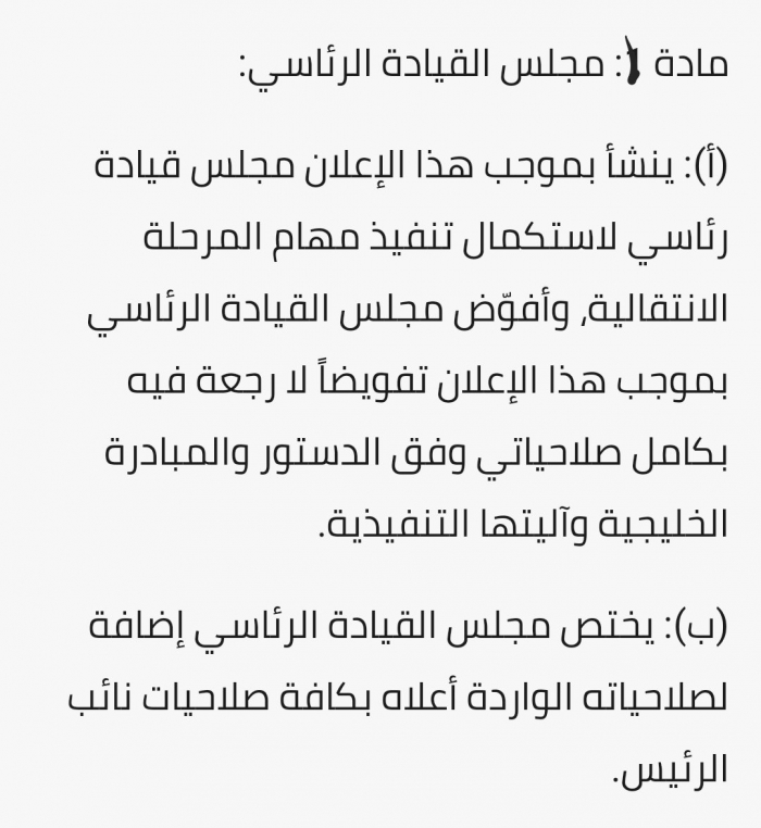 وأوضح أن: "المجلس الرئاسي كما جاء في المادة الأولى من بيان هادي مفوض جماعيا لوظيفة الرئيس ونائبه، و كل محاولة لتغيير هذه المادة يعني حتمية المواجهة، فليعرف حجمه".