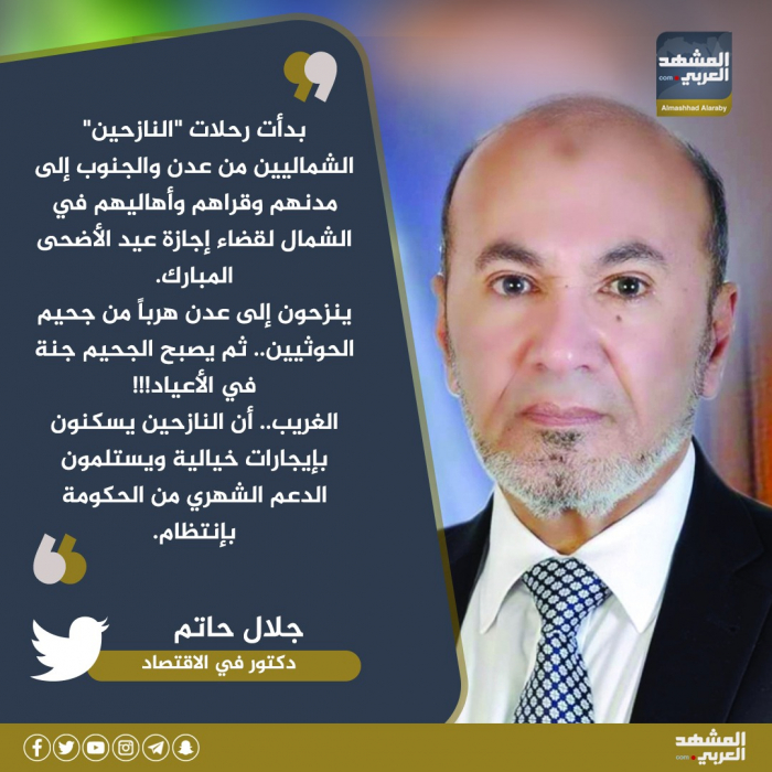 وأضاف أنهم: "ينزحون إلى عدن هربًا من جحيم الحوثيين، ثم يصبح الجحيم جنة في الأعياد، الغريب، إن النازحين يسكنون بإيجارات خيالية ويستلمون الدعم الشهري من الحكومة بانتظام".