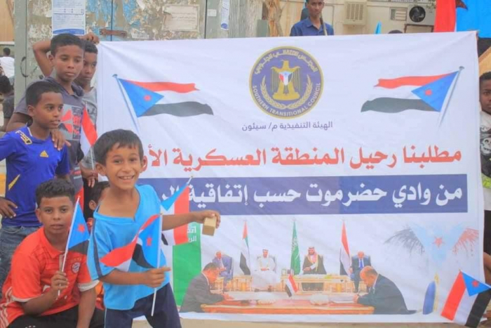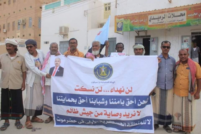 ورفع المتظاهرون لافتات ترفض تواجد المنطقة العسكرية الأولى وتطالب برحيلها فورا من وادي حضرموت، وتمكين المواطنين من إدارة شؤونهم.